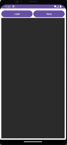 Al abrir la aplicacion se muestra una sencilla interfaz donde solo existen dos opciones. Subir un archivo desde el almacenamiento compartido con el boton Load y guardar el archivo con el boton Save.