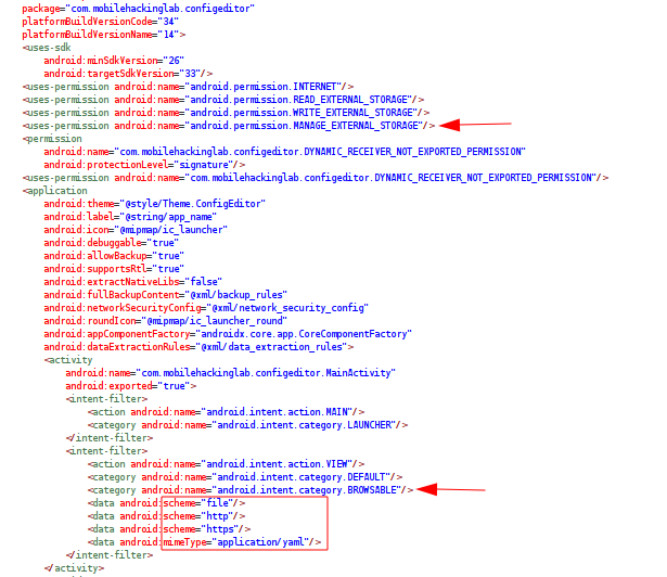MainActivity es el único código propio definido en el archivo. Este Activity actúa como punto de entrada al iniciar la aplicación. La configuración incluye la categoría BROWSABLE, junto con múltiples scheme y un mimeType específico para contenido YAML. Esta configuracion permite recibir datos externos desde un navegador u otras aplicaciones. Considerando el objetivo principal de la aplicación este comportamiento resulta llamativo.