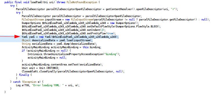 Mirando la clase MainActivity aparecen las funciones que son ejecutadas por los botones de la interfaz. Tras una busqueda, identifico que dentro del método loadYaml() existe una vulnerabilidad conocida CVE-2022-1471.