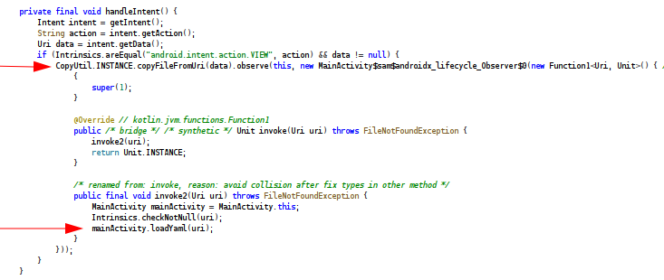 La configuración de MainActivity en el AndroidManifest permite que la Activity reciba un deep link. La aplicación interpreta el Uri como un archivo a cargar y copia su contenido al almacenamiento local. Una vez finalizada la copia, el resultado se entrega a loadYaml(uri), encargado de abrir el archivo y procesarlo. De esta forma, un enlace externo no solo abre la aplicación, sino que también desencadena todo el flujo de carga del archivo de manera automática (CWE-926).