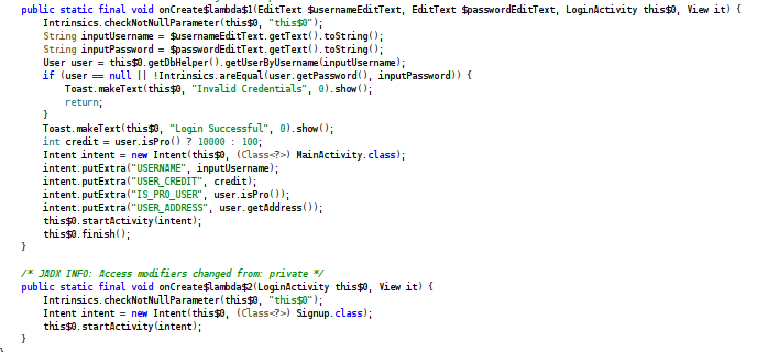 Además, construye un Intent que transporta y expone información sensible del usuario, USER_ADDRESS, IS_PRO_USER y USER_CREDIT. Estos valores determinan tanto el estado de privilegio como la cantidad de créditos asignados. El diseño actual confía completamente en datos enviados desde el cliente. Mediante adb es posible inyectar valores arbitrarios en los extras del Intent para forzar el acceso como un usario privilegiado o directamente manipular los creditos del mismo (CWE-602) .